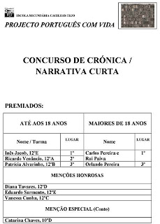 No passado dia 27 de Maio, foram divulgados os premiados do concurso «Crónica/Narrativa Curta» 2010, organizado pelos professores do projecto «PORTUGUÊS COM VIDA».